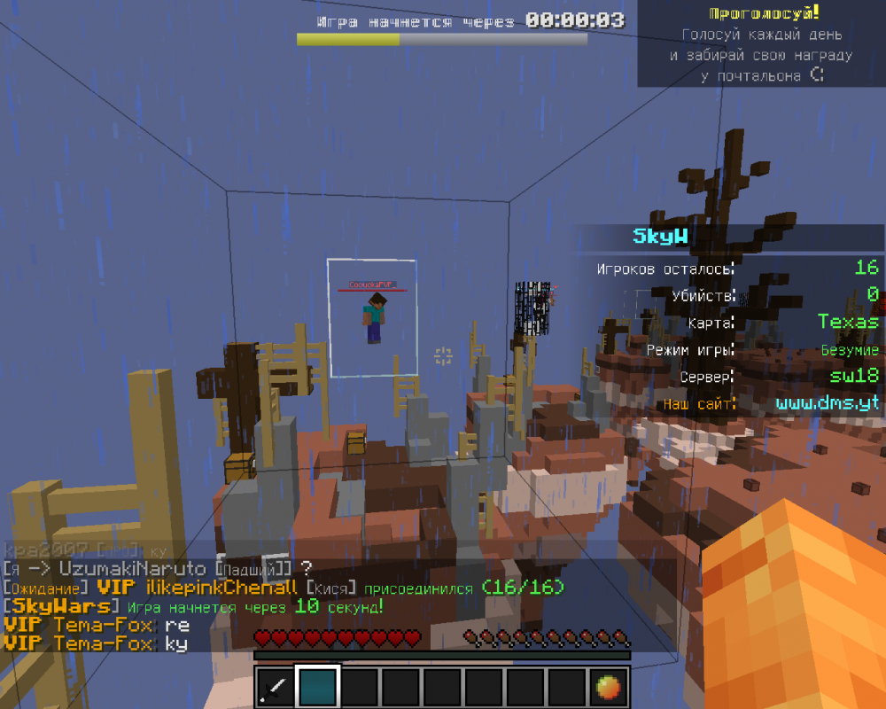 Был пост в ВК, где говорилось, что дождь на СкайВарс был убран. В первые дни его и вправду не было (дождь всегда появляется на карте Texas). Но после нескольких дней этот баг снова вернулся. Дождь раздражает тем, что от него садится FPS и вещи на поджог (лук на огненную стрелу, меч на заговор огня) бесполезны. Ниже показаны скрины, они были сделаны 25.10.2018 в 20:45 по МСК. Они были сделаны 25.10.2018 в 20:45 по МСК